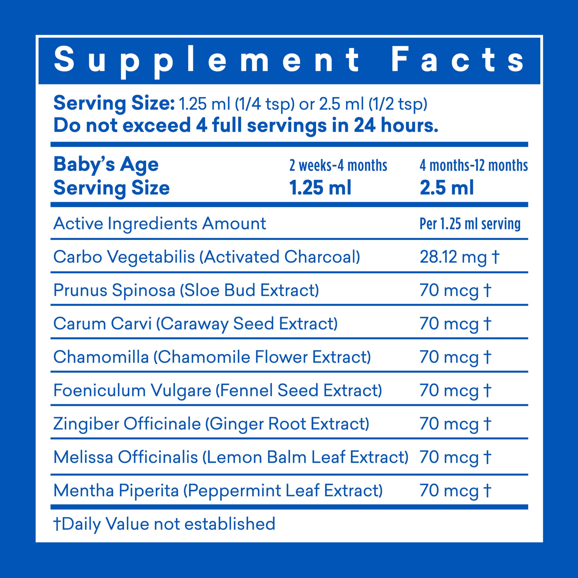 All supplements are carefully selected and must meet our strict quality assurance standards prior to use. All supplements are meticulously calculated and safe for babies. They are all allergen-free and side-effect-free. Our bottles are safety-sealed and batch samples undergo purity testing before release. We use amber glass bottles for maximum stability, quality and purity. The eight supplements in our formula are chamomile, fennel, caraway, ginger, peppermint, lemon balm, blackthorn and vegetable carbon.